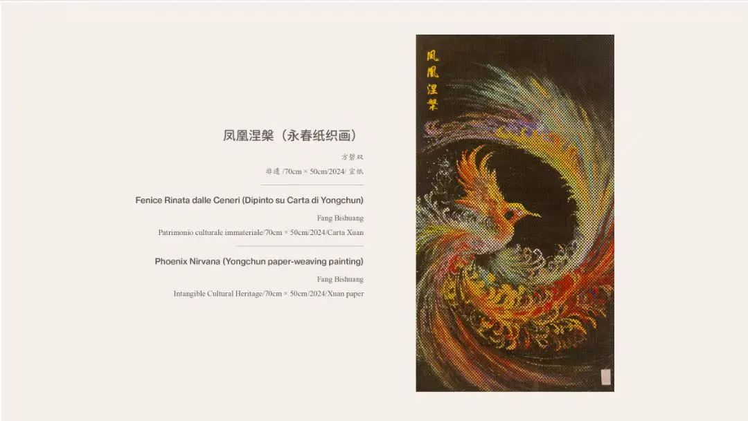 永春紙織畫省級非遺代表性傳承人、福建省工藝美術大師方碧雙的作品《鳳凰涅槃》受邀參展,吸引了眾多意大利民眾及藝術愛好者駐足欣賞,成為展覽中的焦點之一。